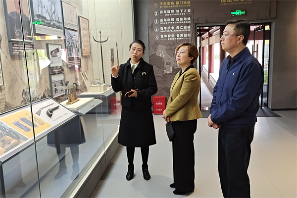 在南京条约史料陈列馆,调研组走访了郑和纪念堂、南京条约议约场景复原展厅、南京条约史料陈列展、中国近代不平等条约展,观看图片实物展示,详细听取讲解介绍。杨雯懿指出,郑和纪念堂、静海寺见证着历史辉煌,也铭刻着百年屈辱,要充分发挥好华侨文化交流基地作用,宣传好、利用好这些爱国主义教育资源,积极引导广大侨界群众,特别是侨界青少年了解祖国的历史,激发广大侨界群众爱党爱国爱乡热情。