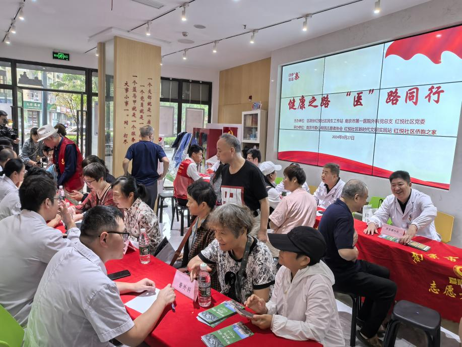 9月29日上午,秦淮区红花街道侨联联合南京市第一医院外科党总支、区政协红悦社区民生工作站共在红悦社区“侨胞之家”开展“健康之路,‘医’路同行——国庆义诊”活动。